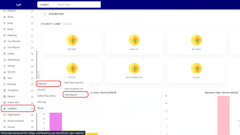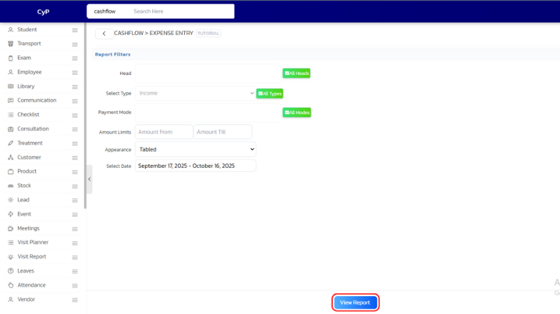 - On the left sidebar, hover on “Cashflow”. A submenu will appear. You can check cashflow reports for “Income”, “Expense”, and “Online Payments”. Whichever report you want to view, hover on it, and another submenu will appear — click on “View Report”.
