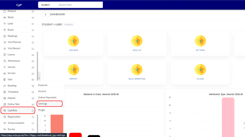 - On the left sidebar, hover on “Cashflow”. A submenu will appear, click on “Settings”.