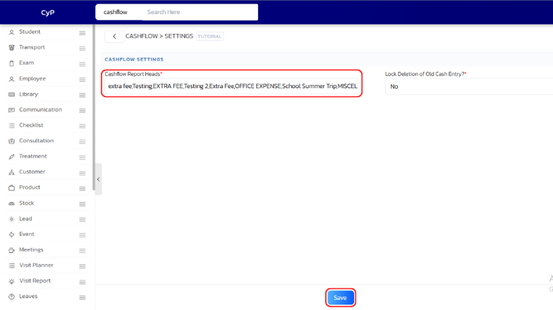 - A page will open. Under the heading “Cashflow Report Heads”, add or update the cashflow heads in a comma-separated manner and click “Save” to apply the changes.