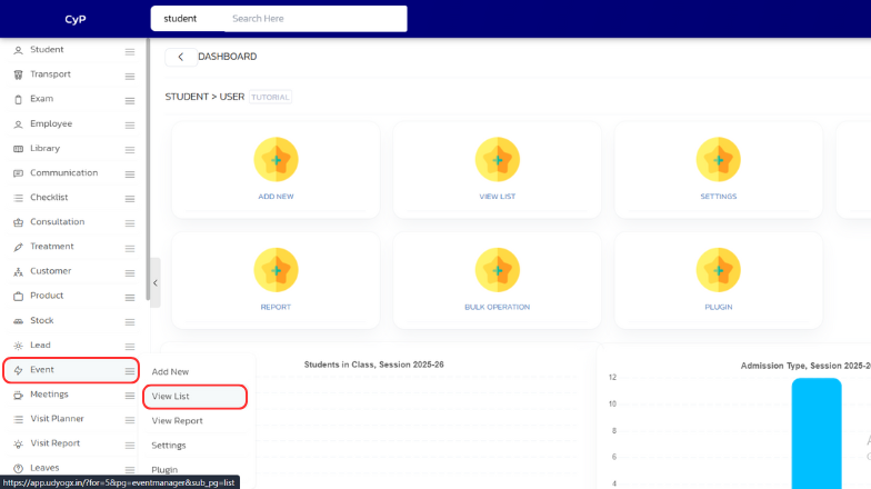 - On the left sidebar, hover on “Event”. A submenu will appear, click on “View List”.