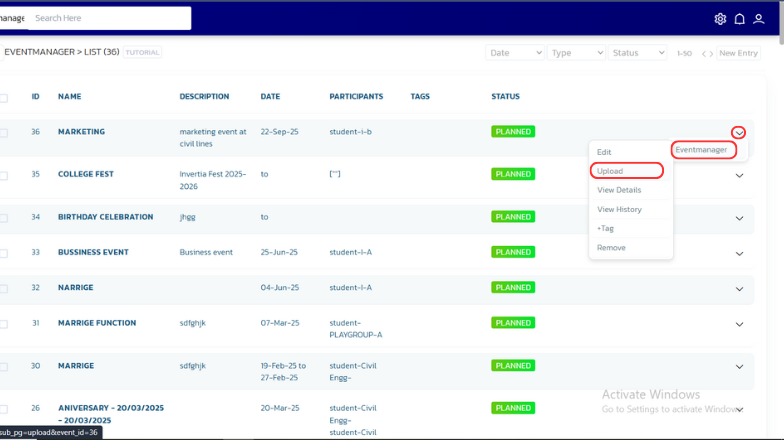 - A list will appear. Whosever documents you want to upload, on the right side, hover on the arrow icon, then hover on “Eventmanager” and click on “Upload”.