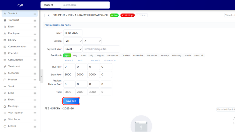 - Enter the ‘Date’, ‘Class’, ‘Payment Info’, Select the month for which fees has been paid, Enter the amount paid by the student in the ‘Paid’ column and then click on ‘Save Fee’
