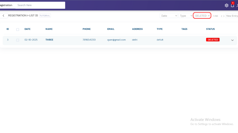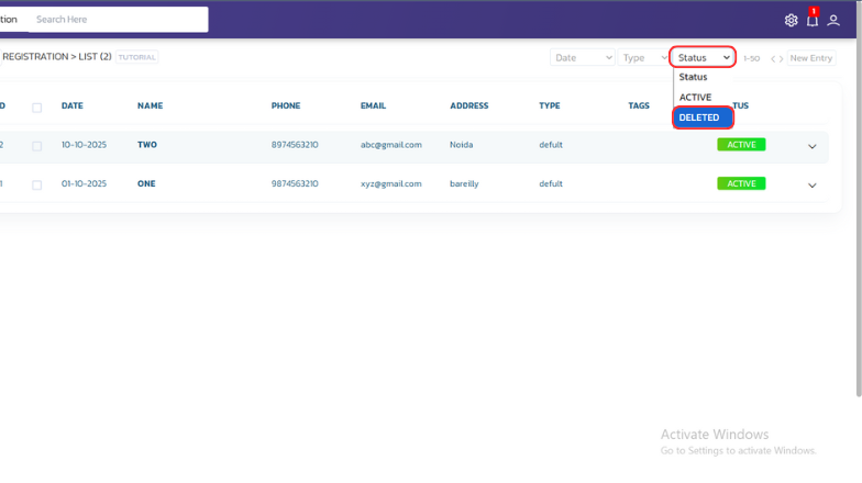 4. Select “Deleted” from the “Status” filter to show the list of deleted students.